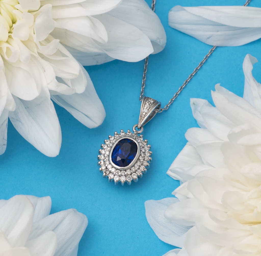 18KT WHITE GOLD PENDANT WITH DIAMOND & BLUE SAPPHIRE